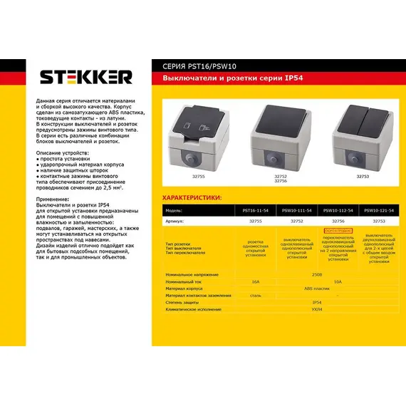 Выключатель PSW10-121-54 STEKKER 2-клавиш, 1-полюс для 2 цепей с об. ввод, 250В, 10А, серый/графит