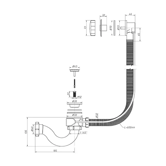 А-2408 Сифон для ванны 1 1/2"х40, «S» тип, полуавтомат, с переливом (пластик-хром)