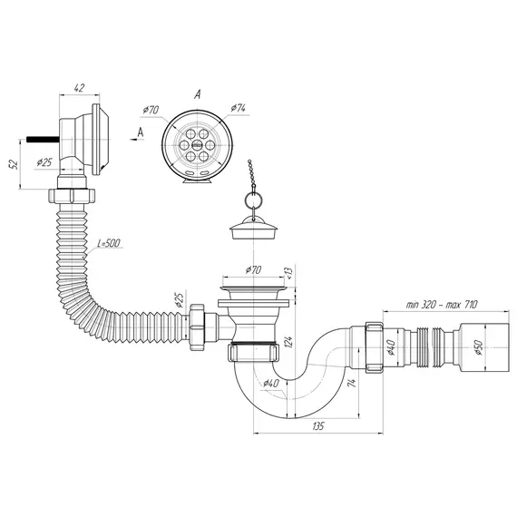 Сифон АНИ Е155 для ванны с выпуском 1 1/2", с переливом, с гибкой трубой 40/50